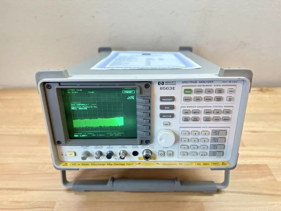 The Agilent 8563E is a portable microwave spectrum analyzer that offers a wide range of performance, features, and optional capability to meet your measurement needs. The 8563E portable microwave spectrum analyzer offers the measurement capability and performance previously found in larger, more expensive benchtop analyzers. This analyzer has a standard frequency range of 9 kHz to 26.5 GHz (preselected from 2.75 GHz to 26.5 GHz), with optional low-end frequency coverage to 30 Hz.